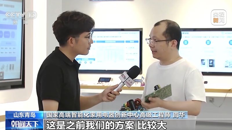 国家高端智能化家用电器创新中心高级工程师 周华:你看现在我手里面拿了两块芯片板,这是之前我们的方案,比较大,这是我们小型化之后一个通用方案。在小型化的过程中,我们加入了人工智能算法,于是在大家家庭生活当中,会看到一些跟你可以语音对话的空调,可以用手势来操控的一些电视。