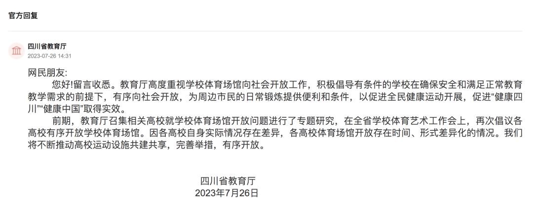 同时,有网友在人民网“领导留言板”上留言,建议以成都大运会为契机,推动大学体育场馆向社会开放。7月26日,四川省教育厅对该网友留言进行了回复,再次倡议各高校有序开放学校体育场馆。