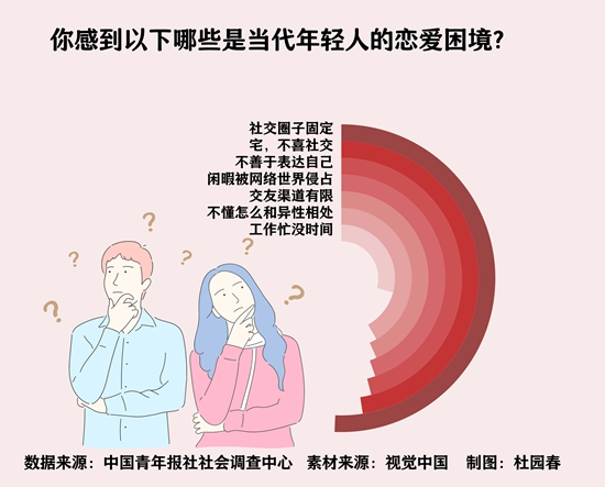 中国青年报社社会调查中心联合问卷网(wenjuan.com),对2004名受访单身青年进行的一项调查显示,社交圈子固定(50.7%)是年轻人面临的最大恋爱困境。对此,许琪也深感认同。“很多青年是渴求遇到另一半的,但现实中存在一些障碍,其中很突出的一点就是职业或专业中的性别隔离。像IT、护士等职业,这种现象更为明显,生活和工作学习圈里的都是同性。”
