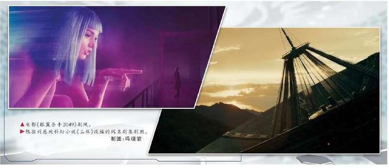 电影《银翼杀手2049》剧照。 根据刘慈欣科幻小说《三体》改编的同名剧集剧照。 制图:冯晓瑜
