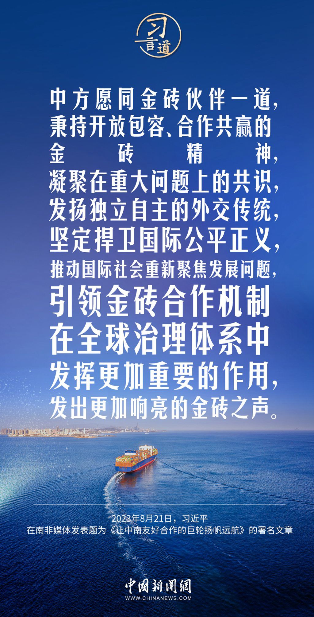 8月21日,在赴约翰内斯堡出席金砖国家领导人第十五次会晤并对南非进行国事访问之际,国家主席习近平在南非《星报》、《开普时报》、《水星报》和南非独立媒体网站发表题为《让中南友好合作的巨轮扬帆远航》的署名文章。习近平指出——