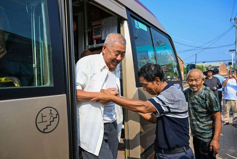 8月17日,在天津市武清区黄花店镇邵七堤村,村委会主任寇之明(左二)迎接村民回村。新华社记者孙凡越 摄