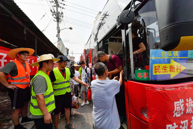 8月20日,在天津市静海区台头镇,村民有序下车准备回家。新华社记者孙凡越 摄