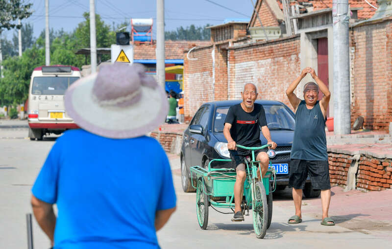 8月17日,在天津市武清区黄花店镇邵七堤村,返村村民相互问候打招呼。新华社记者孙凡越 摄