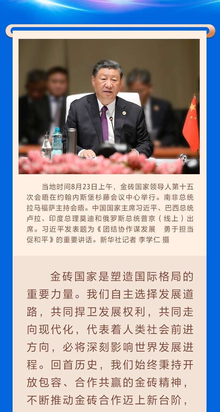 当地时间8月23日上午,金砖国家领导人第十五次会晤在约翰内斯堡杉藤会议中心举行。国家主席习近平发表题为《团结协作谋发展 勇于担当促和平》的重要讲话。人民网带您重温习近平主席讲话要点并邀请专家解读。