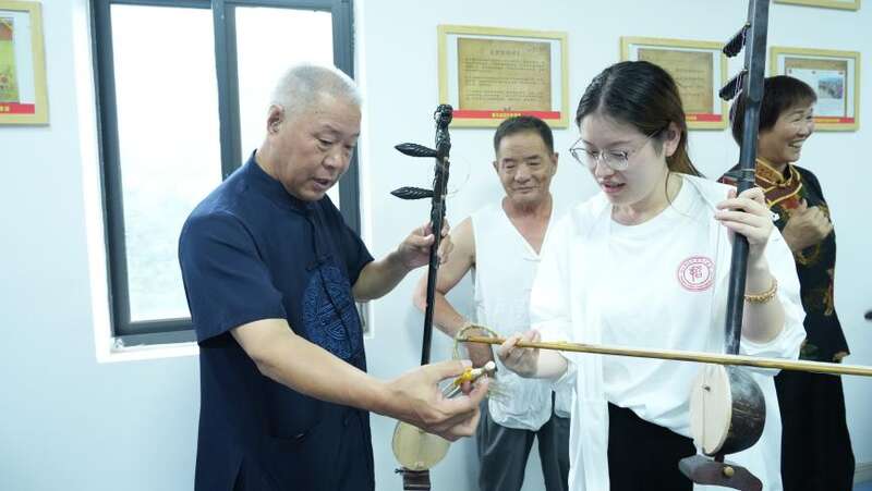 ∆ 老腔艺术家教大学生板胡演奏技法。余崔琬/摄