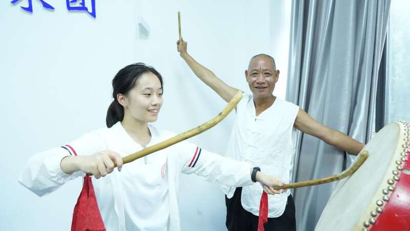 ∆ 老腔艺术家教大学生鼓敲打技法。余崔琬/摄