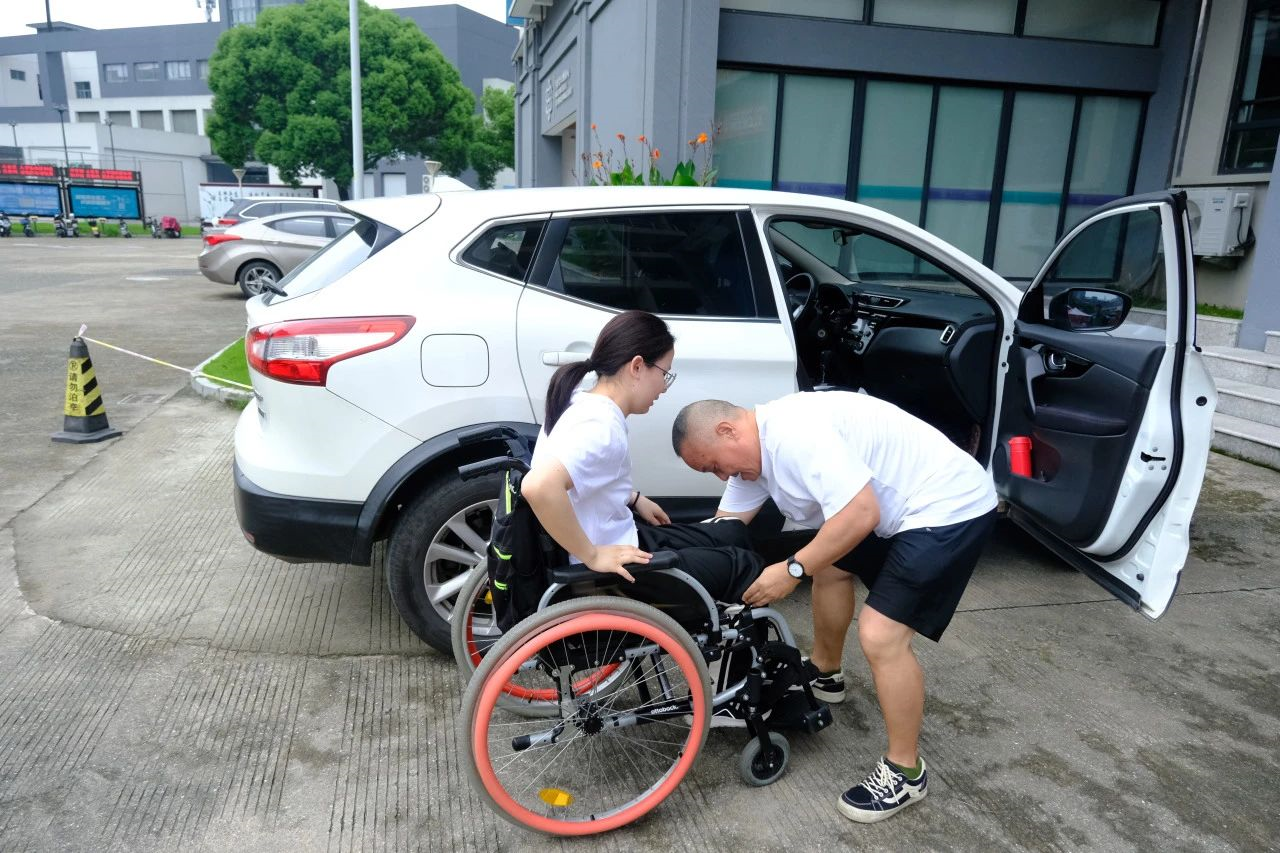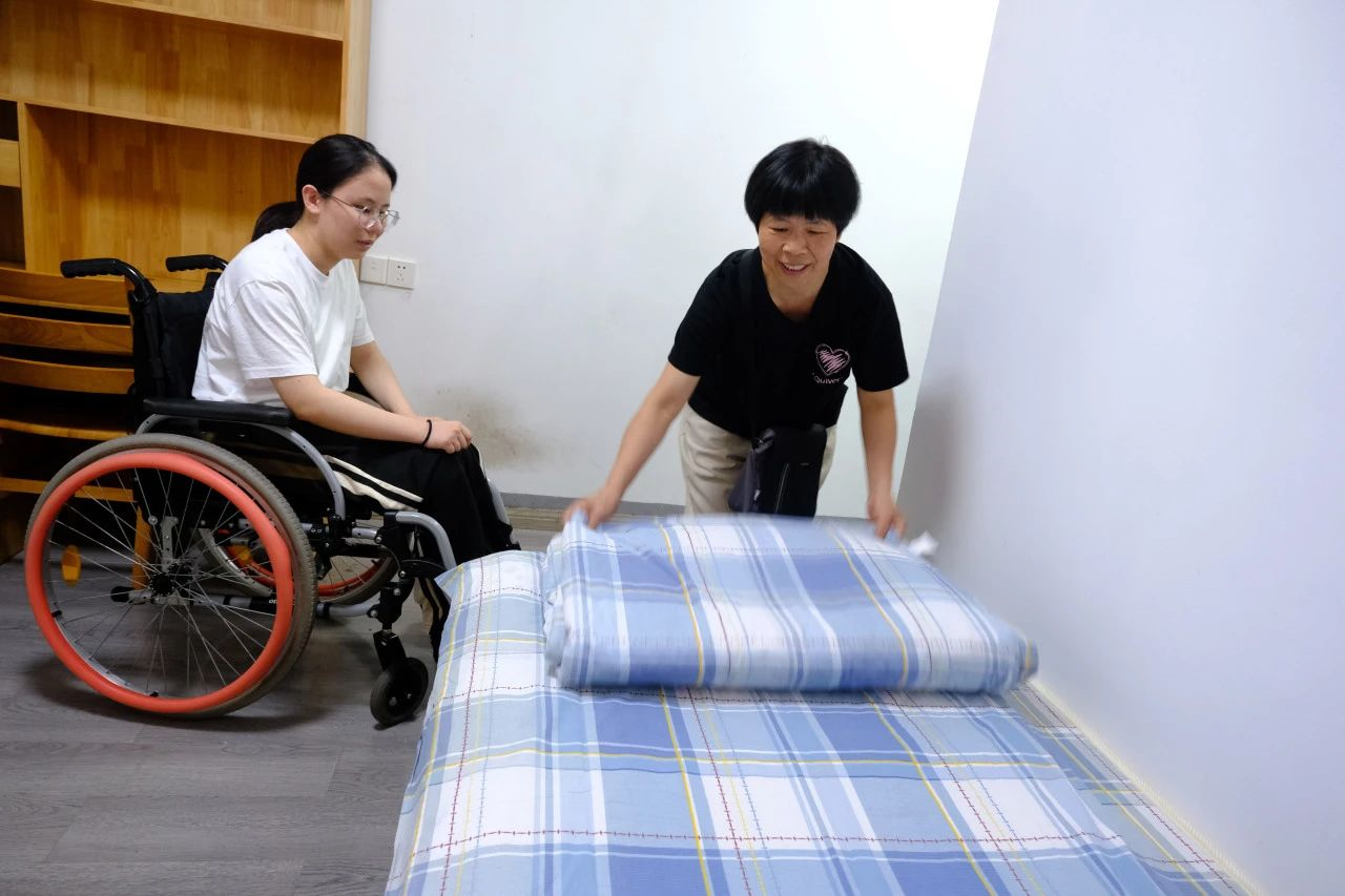 1.67米的个头、90多斤重的姑娘,50多岁的徐爸爸一把把她从车上抱起,轻轻放在轮椅上,一家人缓步走向宁大北区学生公寓宿舍楼。接下来四年,徐天仪一家将在这里度过。