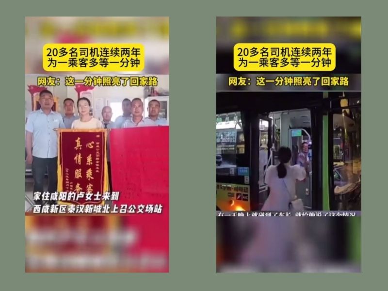 陕西西安,家住咸阳的卢女士,2021年7月起开始到西安工作,下班后需乘坐地铁14号线到达长陵站,步行几分钟后到达窑店街道办站,转乘1141路公交车回家。因为赶的是末班车,时间就显得特别紧张。某天晚上,她在乘坐1141路公交车时,向驾驶员说了下情况,从那之后车辆基本都会多等她一分钟,这一等就是两年,而这也成为了他们之间的一个约定。1141线路路长张宝说,他们线路的20名车长都参加过“末班车多等一分钟”。