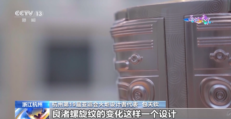 杭州第19届亚运会火炬设计者代表 包天钦:在炬身上刻有的是良渚螺旋纹的变化这样一个设计,螺旋纹在良渚是运用得比较广泛,也是中国最古老的纹饰之一。