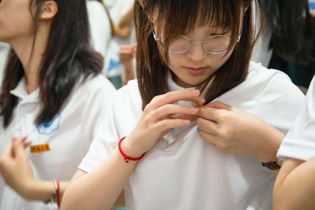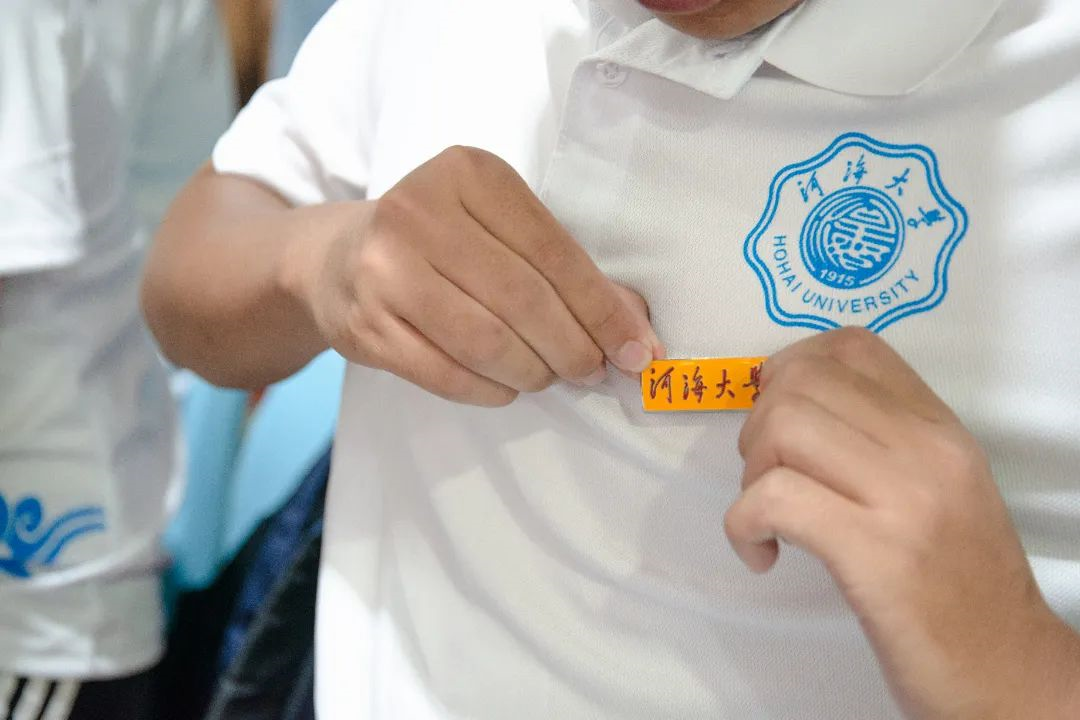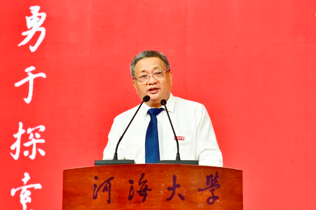 水利水电学院2021级硕士研究生王慧同学作为在校生代表发言,鼓励新同学们“小我融入大我”,扛牢青年实干担当;以坚持研究初心,擦亮青春奋斗底色;以“全面发展”塑“形”,绘就生活多彩画卷。唐洪武为研究生新生代表土木与交通学院2023级直博生袁浩宸佩戴校徽。袁浩宸作为新生代表发言,表示将以“毋负邦人期”的担当,勇接历史的接力棒,努力成为具有“中国灵魂、全球视野、河海特质”的新时代河海人。