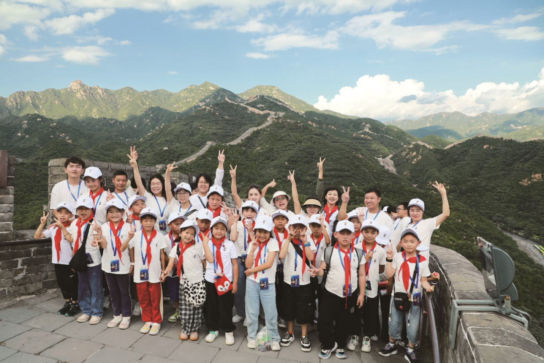 8月31日,孩子们在长城与志愿者合影留念。
