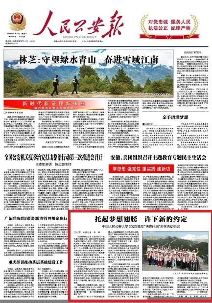 9月4日,《人民公安报》头版报道了我校2023年度“扶志计划”游学活动侧记,题为《托起梦想翅膀 许下新的约定》,全文如下: