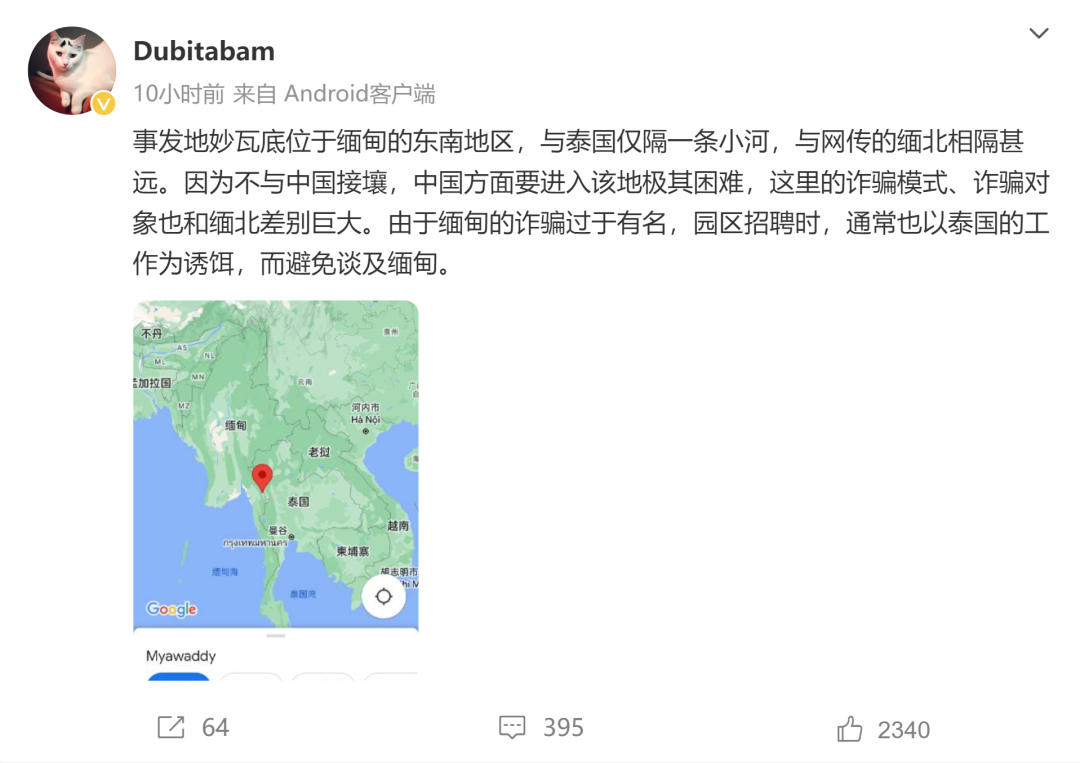 张实称,事发地妙瓦底位于缅甸的东南地区,与泰国仅隔一条小河,与网传的缅北相隔甚远。因为不与中国接壤,中国方面要进入该地极其困难,这里的诈骗模式、诈骗对象也和缅北差别巨大。由于缅甸的诈骗过于有名,园区招聘时,通常也以泰国的工作为诱饵,而避免谈及缅甸。