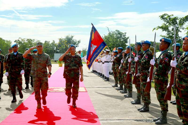 中柬任务分队指挥员一起检阅柬军仪仗队。