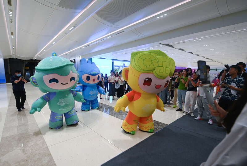 亚运会吉祥物“琮琮”“莲莲”“宸宸”在主媒体中心与记者互动(9月1日摄)。(图片来源:新华社)
