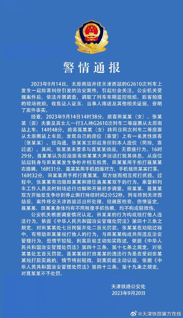 沸沸扬扬的“女子高铁被占座换回后遭殴打”事件,迎来了最新通报。对比此前的热搜词条和网络信息,可以发现存在一些出入。比如,张某某未要求与聂某某换座,无霸座行为;冲突是发生在聂某某认为后座旅客田某某大声说话打扰其休息之后。