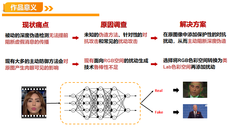 团队成员们深度学习了针对deepfake 技术的防御,特别是 GAN 神经网络有了充分的理解。并对涉及到的人脸信息采集,颜色空间和加密算法领域都进行了研究。不同于传统颜色空间,他们采用了新的 Lab 空间,并对颜色空间的转换做了创新性的加密处理,大大增加了其不可感知性和安全性。