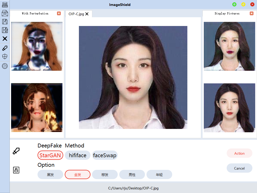 Imageshield 是一款聚焦人脸特征属性保护的软件,它拓展了安全的保护性扰动添加技术,通过对颜色空间的加密和在人脸图片上添加保护性扰动,可以对任意人脸图片实施保护,防御多种 DeepFake 攻击,还可以防止攻击者通过暴力破解,在标准颜色空间内对扰动进行针对性的去除。
