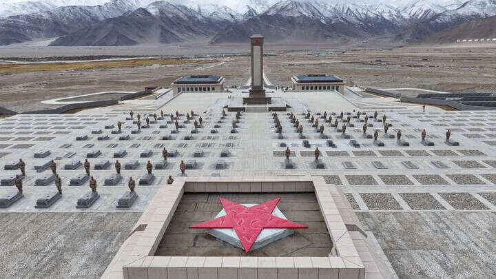 ↑驻守西陲的新疆军区某团官兵来到康西瓦烈士陵园祭奠英烈(视频截图,2023年9月25日摄)。新华社记者 白志强 摄