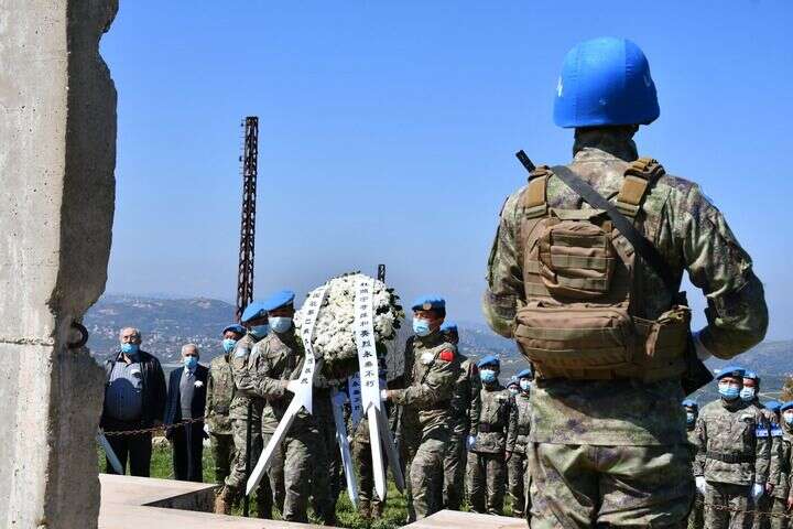 ↑中国维和官兵在黎巴嫩南部希亚姆镇向烈士纪念碑敬献花圈(2021年4月4日摄)。新华社发(丁文栋 摄)