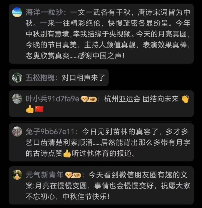 直播过程中,主持人苗霖和中国诗词大会第六季总冠军陈曦骏的中秋“飞花令”等精彩片段引发了收听、收视高潮,评论区好评如潮。