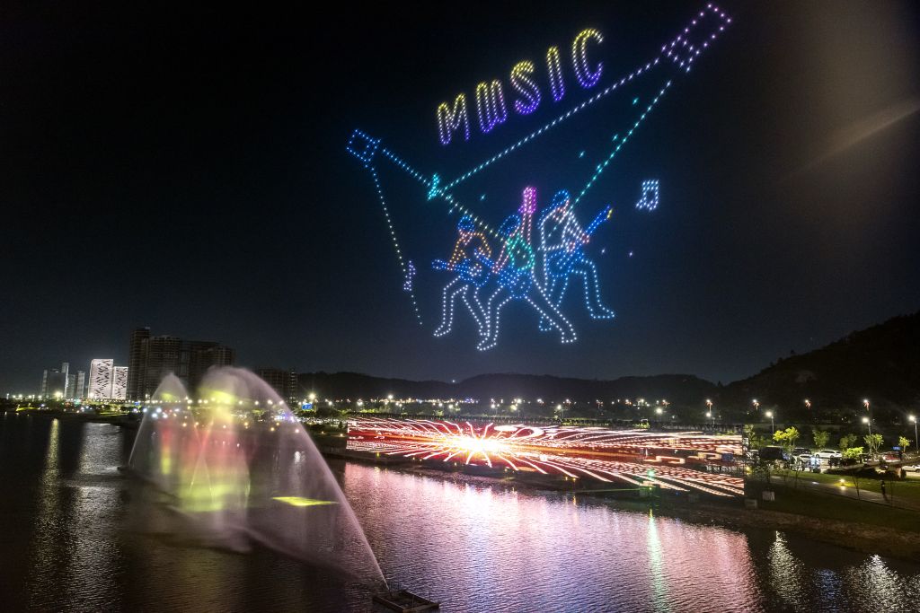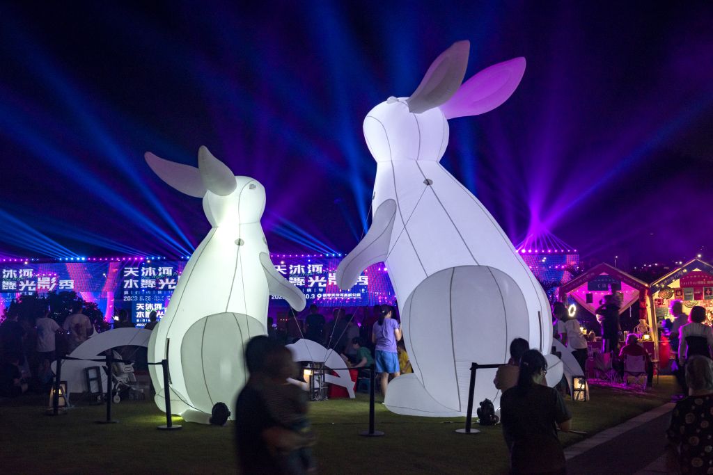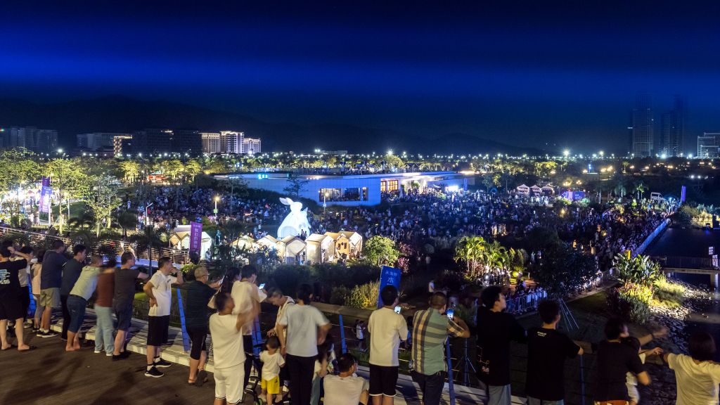 2023年9月29日,广东珠海,中秋节当晚,横琴粤澳深度合作区在天沐河赛艇公园举行大型游园活动。粤澳两地及外地游客上万人一起品赏美食,欣赏河畔音乐会,观看水舞灯光秀和无人机表演。活动现场人头攒动,掌声喝彩声回响在天沐河畔。