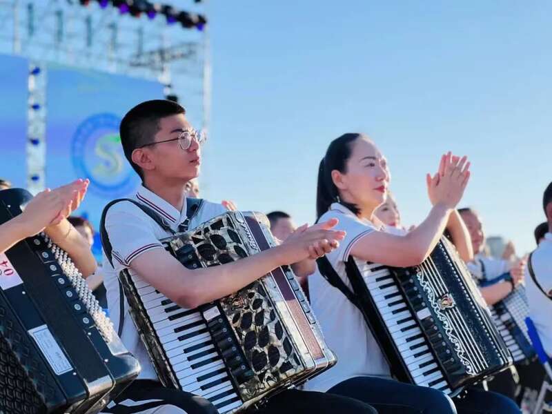 参加本次合奏的线下手风琴演奏者中,年龄最大的有80岁,最小的只有6岁;还有来自俄罗斯、哈萨克斯坦、芬兰、新西兰、意大利的手风琴艺术家。合奏总指挥、中国音乐家协会手风琴学会会长李聪说,塔城市把手风琴发展成了一个文化品牌,可以强烈感受到塔城人民对手风琴发自心底的热爱。