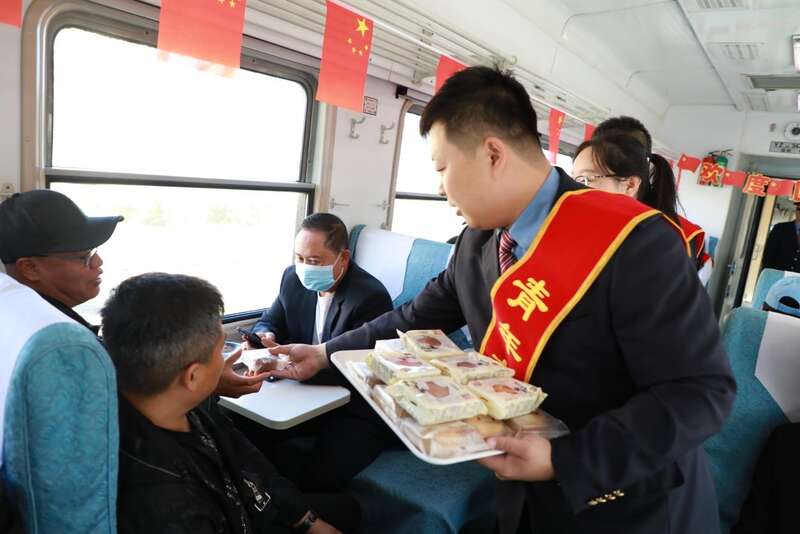 为喜迎中秋、国庆双假期,4066次列车组织开展“喜迎中秋,欢度国庆”活动,青年志愿者们提前准备精美节日礼物,与旅客共同表达对祖国的热爱和祝福。