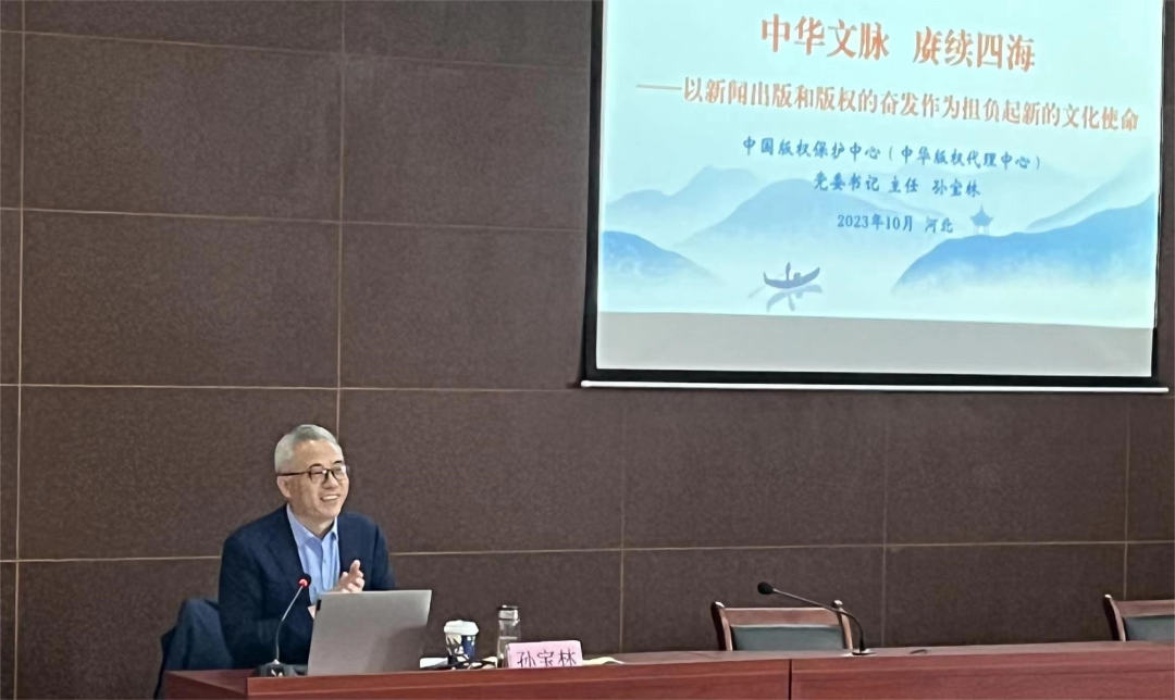 孙宝林应邀作了题为《中华文脉赓续四海:以新闻出版和版权的奋发作为担负起新的文化使命》的报告,从深入学习贯彻习近平文化思想、守好马克思主义魂脉与中华优秀传统文化根脉、发挥新闻出版的载体和阵地作用、版权历史文化与法治研究、数字时代版权的机遇与挑战、以青春之力担负起新的文化使命等六个方面进行了生动讲授。