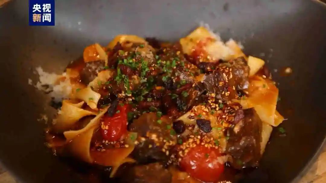 院落里的餐厅,有一道中西合璧的意大利面,跟这栋楼“融合”特点很相似,它里面有红酒慢炖牛肉、猪油渣还有油泼辣子。还有一道是用中国独有的食材——百合做的慕斯。