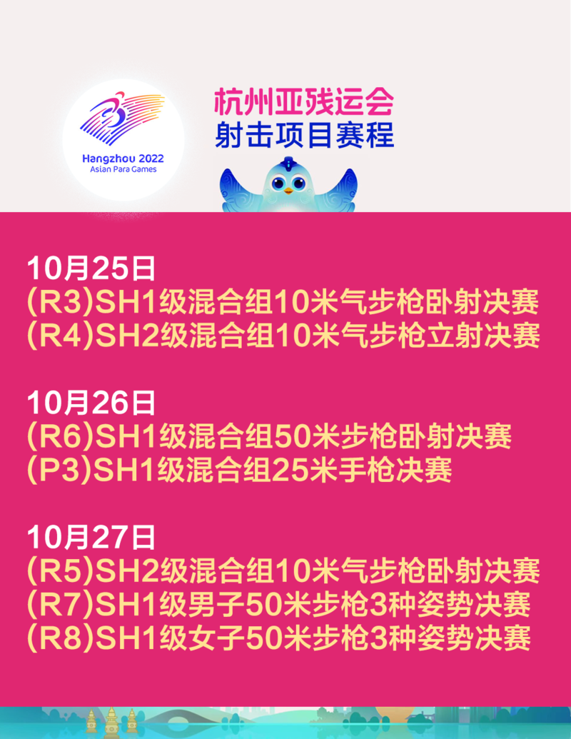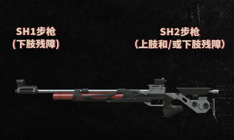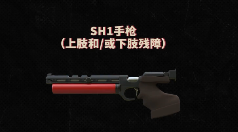 残疾人射击项目,按照肢体残障部位的不同,分为SH1(手枪)、SH1(步枪)和SH2(步枪)三个级别。运动员参加手枪或步枪的比赛,步枪射击姿势分为立姿、跪姿、卧姿三种 。比赛射击距离分为10米、25米和50米。