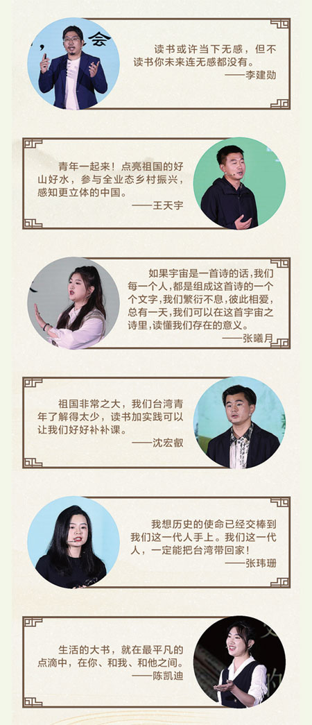 “我自己是从成长阶段借由读书建立正确的国家认同,又透过阅读走入祖国大地,祖国非常之大,我们台湾青年了解得太少,读书加实践可以让我们好好补补课,深化两岸的交流”。
