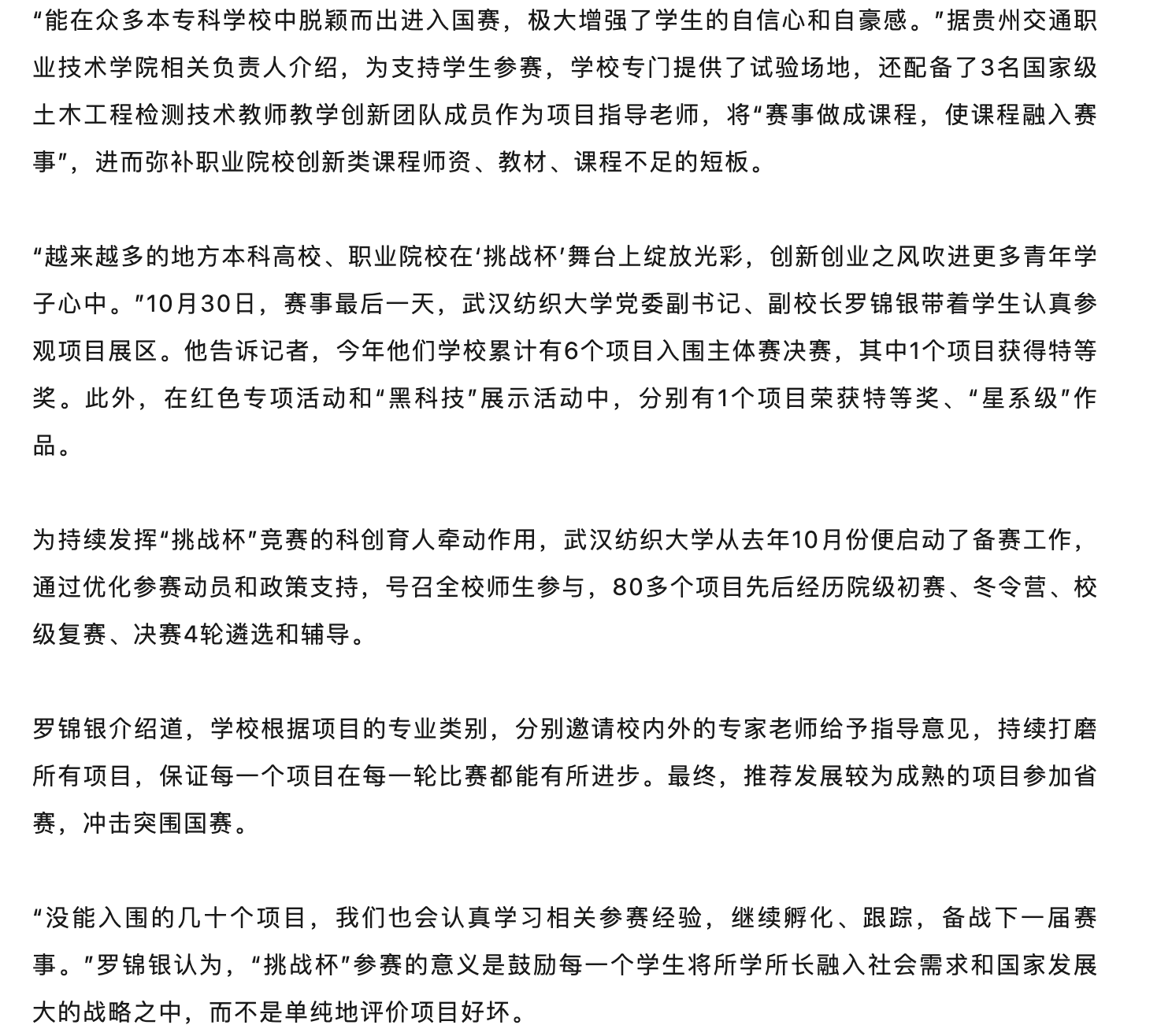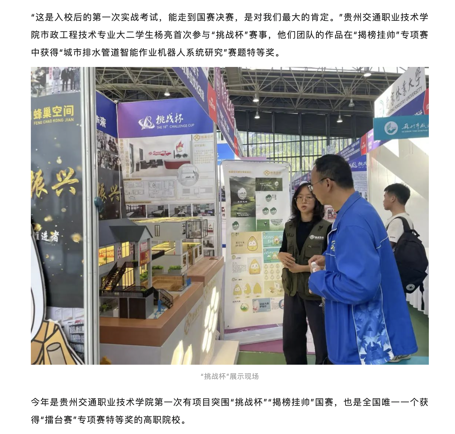 一个职业院校的项目不仅走到了“挑战杯”决赛的赛场上,还在“揭榜挂帅”专项赛中获得特等奖,成为全国唯一一个获得“擂台赛”专项赛特等奖的高职院校。