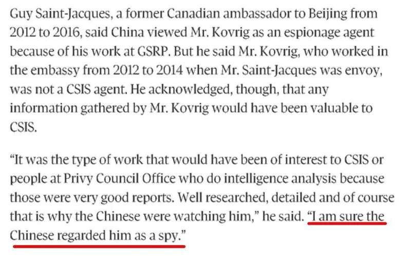 因为一名曾经在加拿大驻华大使馆工作过的前外交官就直言不讳地对《环球邮报》透露,尽管加拿大驻华大使馆那个从事情报工作的部门并不属于加拿大安全情报局这个加拿大的正牌间谍机构,但这个部门搜集的情报对后者而言一直是“很有价值”的。所以——这名前外交官说——也难怪中国方面会将康明凯视作间谍。