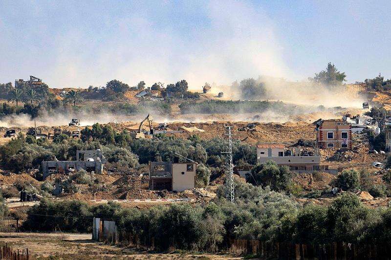当地时间11月18日,巴勒斯坦加沙地带南部,巴以冲突持续,以军卡车和吉普车在边界地区来回穿梭。