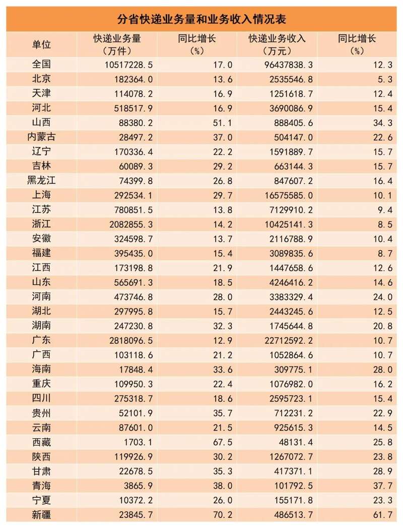 1-10月,东、中、西部地区快递业务量比重分别为75.5%、16.5%和8.0%,业务收入比重分别为76.3%、14.0%和9.7%。与去年同期相比,东部地区快递业务量比重下降1.4个百分点,快递业务收入比重下降1.2个百分点;中部地区快递业务量比重上升0.9个百分点,快递业务收入比重上升0.6个百分点;西部地区快递业务量比重上升0.5个百分点,快递业务收入比重上升0.6个百分点。
