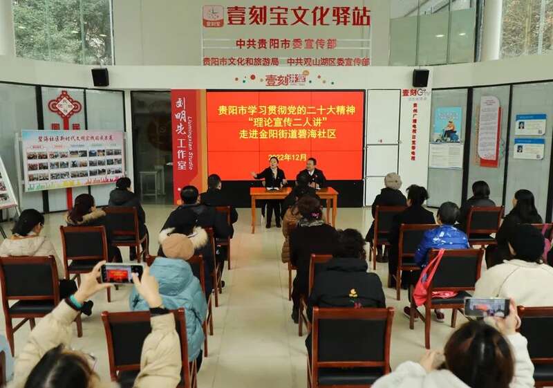 贵阳市观山湖区金阳街道碧海社区开展的“理论宣讲二人讲”,观山湖区委党校副校长李兴波与党的二十大代表、金阳街道金元社区党总支书记、居委会主任袁琴,你说理论,我摆事实。两人互相配合,将党的二十大精神与“一圈两场三改”相结合,既有深入浅出的理论宣讲,又有贴合实际的案例,和大家一起畅谈着身边看得见、摸得着的改变。