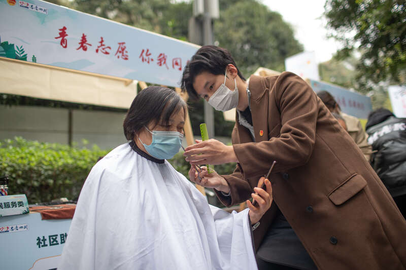 12月5日,四川成都人民公园,一位志愿者为市民免费理发。当天是第38个国际志愿者日,40支志愿服务队伍在现场为市民提供了心肺复苏培训、义诊、免费理发等16种志愿服务和宣传讲解。汪龙华/摄