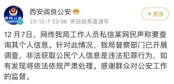 12月7日深夜,西安市阎良区公安局发布通报:督察部门已开展调查,如发现将依法依规严肃处理。