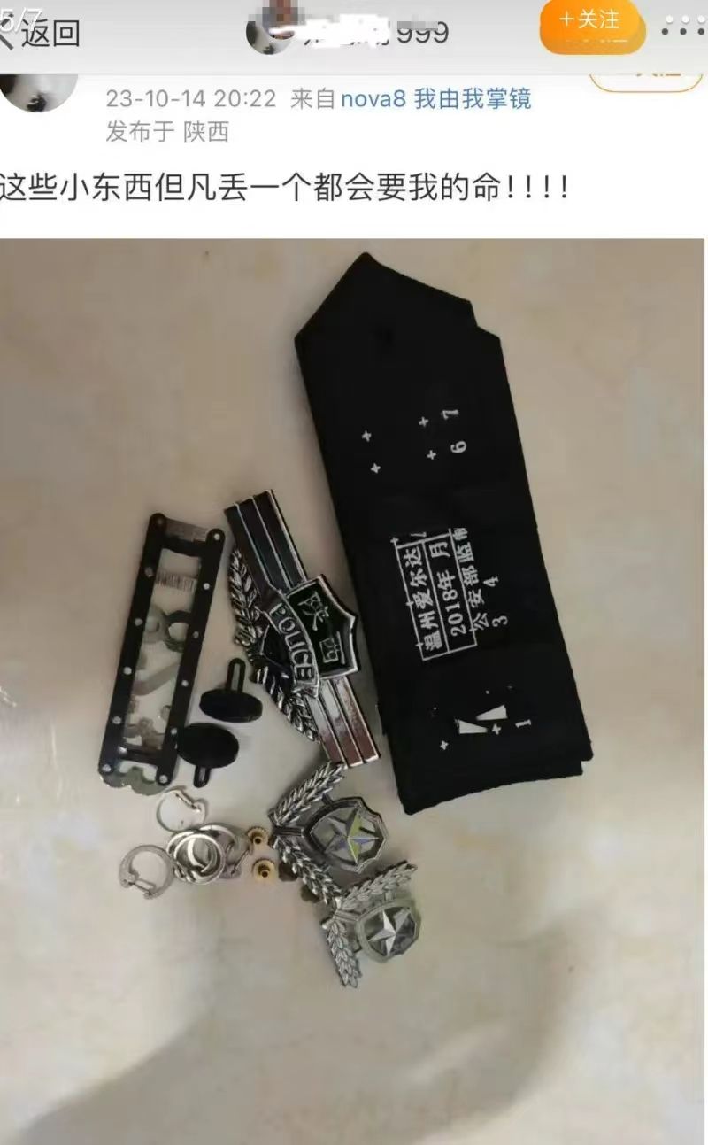 该网友提供的其他截图显示,“别感动999”疑似为西安市公安局阎良分局的一名警务人员。“别感动999”曾在10月14日发布一条微博,展示了警务人员的相关工作标识和证件信息,包括肩章、胸牌、胸扣等。