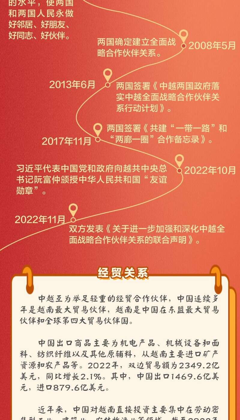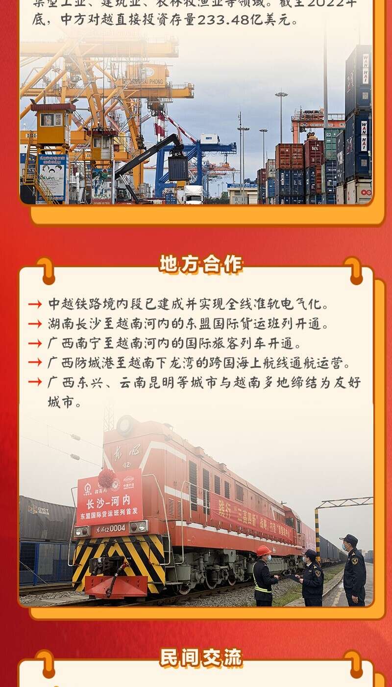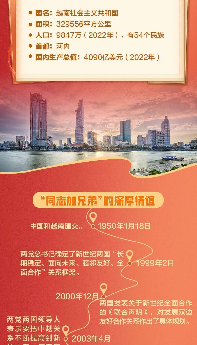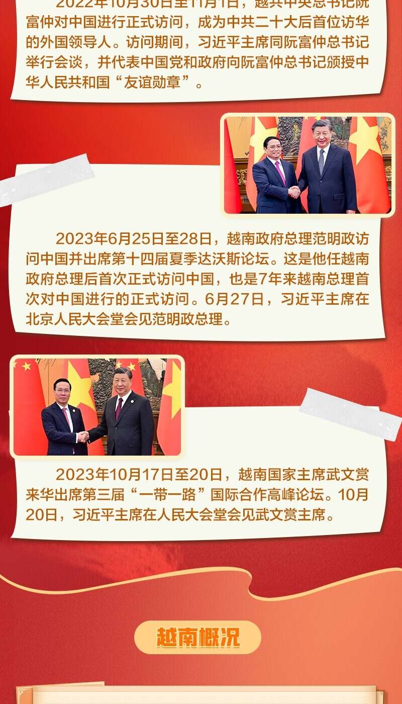 近年来,中越两国之间一直进行着紧密的高级别往来。去年10月底11月初,越共中央总书记阮富仲访华,成为中共二十大后首位来访的外国领导人。今年是中越建立全面战略合作伙伴关系15周年,越南总理范明政、国家主席武文赏先后访华。在两国领导人引领下,中越保持着“同志加兄弟”的特殊关系,双方达成许多重要共识。