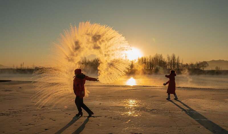泼水成冰。最近几年,冬天去东北旅游的游客们多了一个保留项目,那就是玩一次“泼水成冰”。找一个带滤网的保温杯,装上90℃的水,选一处漂亮的背景,跳跃,挥洒,一瞬间水雾或小冰珠四散开来,在空中划出一道美丽的圆弧。这样一张大片,绝对会让你成为朋友圈里“最靓的仔”。