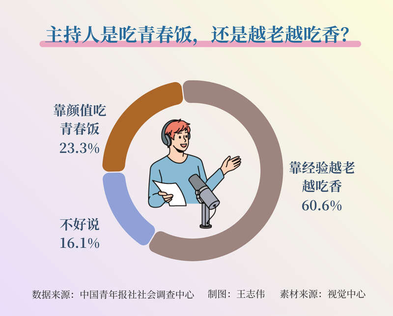 调查显示,60.6%的受访者认为主持人靠经验,越老越吃香。