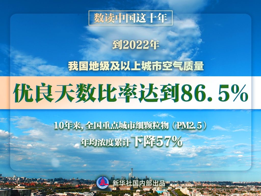 天更蓝、空气更清新。10年来,我国淘汰“散乱污”企业,实施北方地区清洁取暖,推动货物运输“公转铁”,提高机动车油品排放标准……打好产业、能源、交通结构转型的“组合拳”。到2022年,全国PM2.5年均浓度达到29微克/立方米,地级及以上城市空气质量优良天数比率达到86.5%。