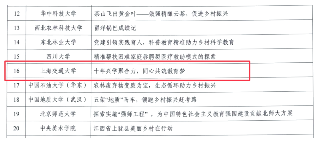 近日,教育部公布了“第八届教育部直属高校精准帮扶典型项目”推选结果。上海交通大学在75所教育部直属高校报的84个项目中脱颖而出,“十年兴学聚合力,同心共筑教育梦”项目获评精准帮扶典型项目!