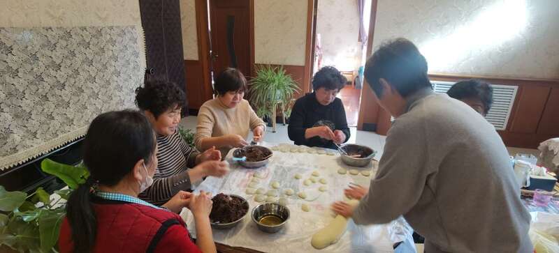 村南头的张爱琴家,七八个婆姨们聚在一起,和面的和面,蒸面的蒸面,包糕的包糕,手上不停,嘴上也不停,乐呵呵拉着家常,没一会儿就包了满满一桌的糕。