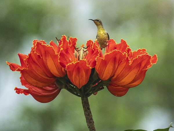 海南琼海:万泉河畔火焰花盛放 小鸟俏立枝头