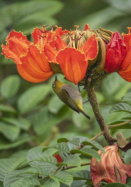 2024年3月10日,海南省琼海市万泉河公园,一只小鸟在盛开的火焰花上寻找猎物。