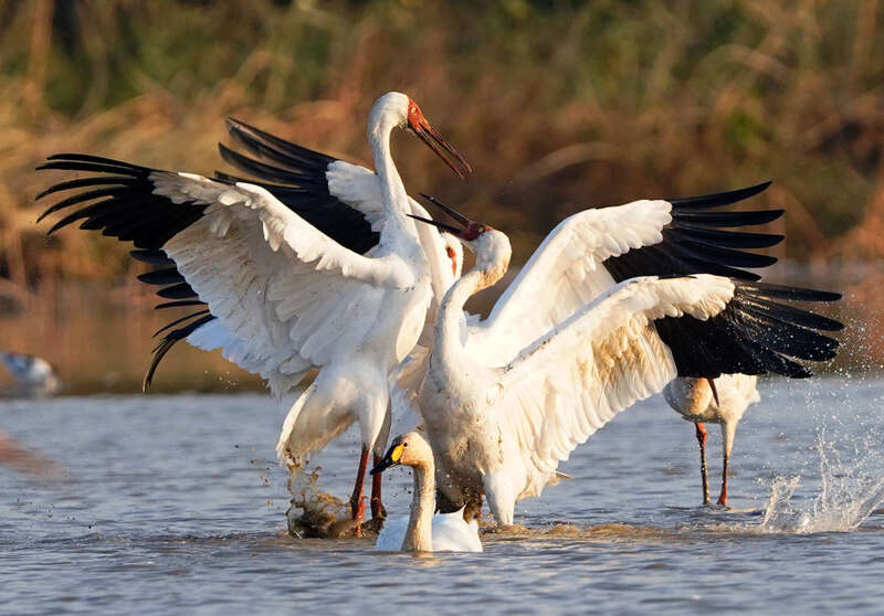 ↑白鹤在江西鄱阳湖湖区的湿地嬉戏(2022年12月21日摄)。 新华社记者 万象 摄